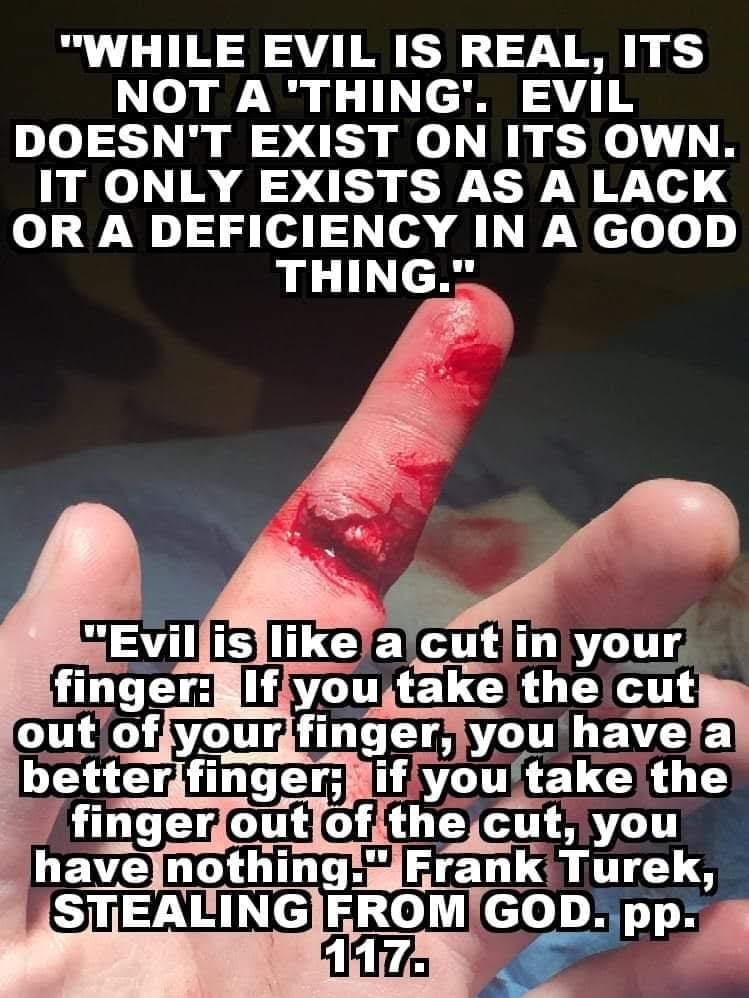 Jeg vil kaste frem at ingensteds i dyreverdenen ser vi ondskap som kommer noe i nærheten av å sammenligne med de uheldige dybder av ondskap som menneskeheten viser gjennom vår registrerte historie. Den kategoriske forskjellen i menneskelig ondskap kontra dyrs atferd, er motsatt i lys av hva som kan forventes fra et evolusjonært syn på menneskelig opprinnelse.