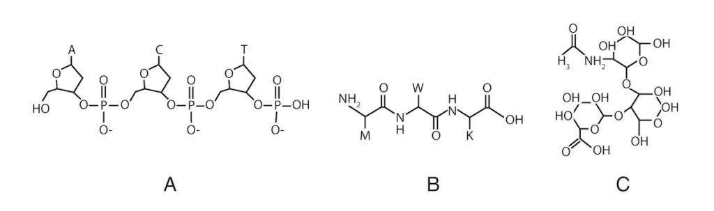 Illustrasjon: Tre underenheter knyttet sammen i DNA (A), et protein (B) og et glykan (C).