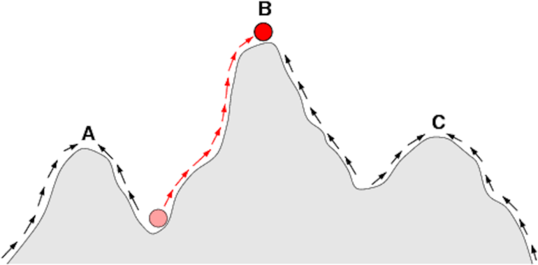 I egnethets temer vil naturlig utvalg alltid skyve "opp bakken", men en art kan normalt ikke komme fra en lavere topp til en høyere topp uten å først gå gjennom en dal."