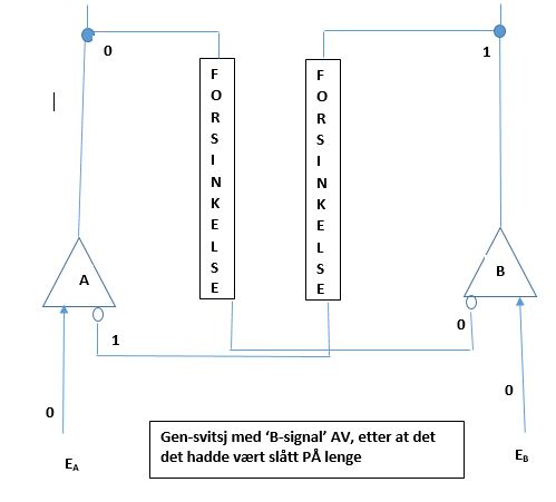 bare var på i kort tid. Anta at det gikk tilbake til 0, før repressoren tilvirket av gen A ble faset ut. Da vil vi ha at selv om output fra gen A er 0, så er repressoren til gen B fortatt 1. som vist i Bilde 9. Når