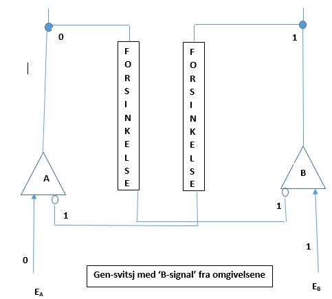nå blir 0, så slås gen B AV. Begge gener er AV, og svitsjen er i en ustabil status. Med både A og B AV, blir repressor-degraderende funksjon aktivert, og repressorene til både A og B deaktiveres. Det som så skjer, er avhengig av hvilken av repressorene som først forsvinner. Om omgivelsessignalet