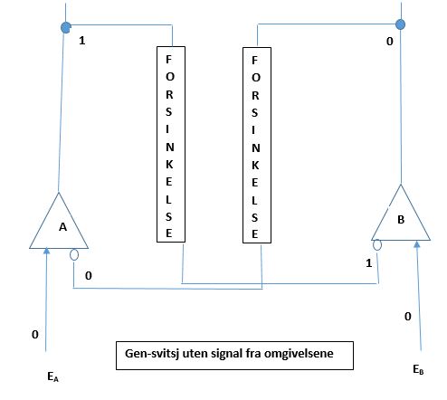 utelukker hverandre gjensidig: begge kan ikke være PÅ, men begge kan være AV. Bilde 6 -over, viser en tilstand der begge signaler fra omgivelsene er AV. Tilstanden er stabil fordi output fra A undertrykker B og holder det AV. Gen A er på fordi repressor input er AV (0). Denne tilstanden vil kunne forbli uten signaler fra omgivelsene. Svitsjens tilstand vil oveføres til neste generasjon, og er dermed arvelig, gjennom utallige celledelinger. Repressor proteinet blir delt mellom dattercellene, som vil fortsette å lage det, siden det ikke forekommer noen repressor til gen A. Så lenge A er på, holdes B AV. Gen A vil fortsette å danne repressor-proteiner for gen B, og bygge opp nivået i datterceller som det var i morcellen. Denne prosessen vil fortsette med hver celledeling, og det er dette som gjør tilstanden arvelig. Dette vil fortsette så lenge det ikke kommer nye signaler fra omgivelsene. I Bilde 6 er det ingen signaler fra omgivelsene, som verken er